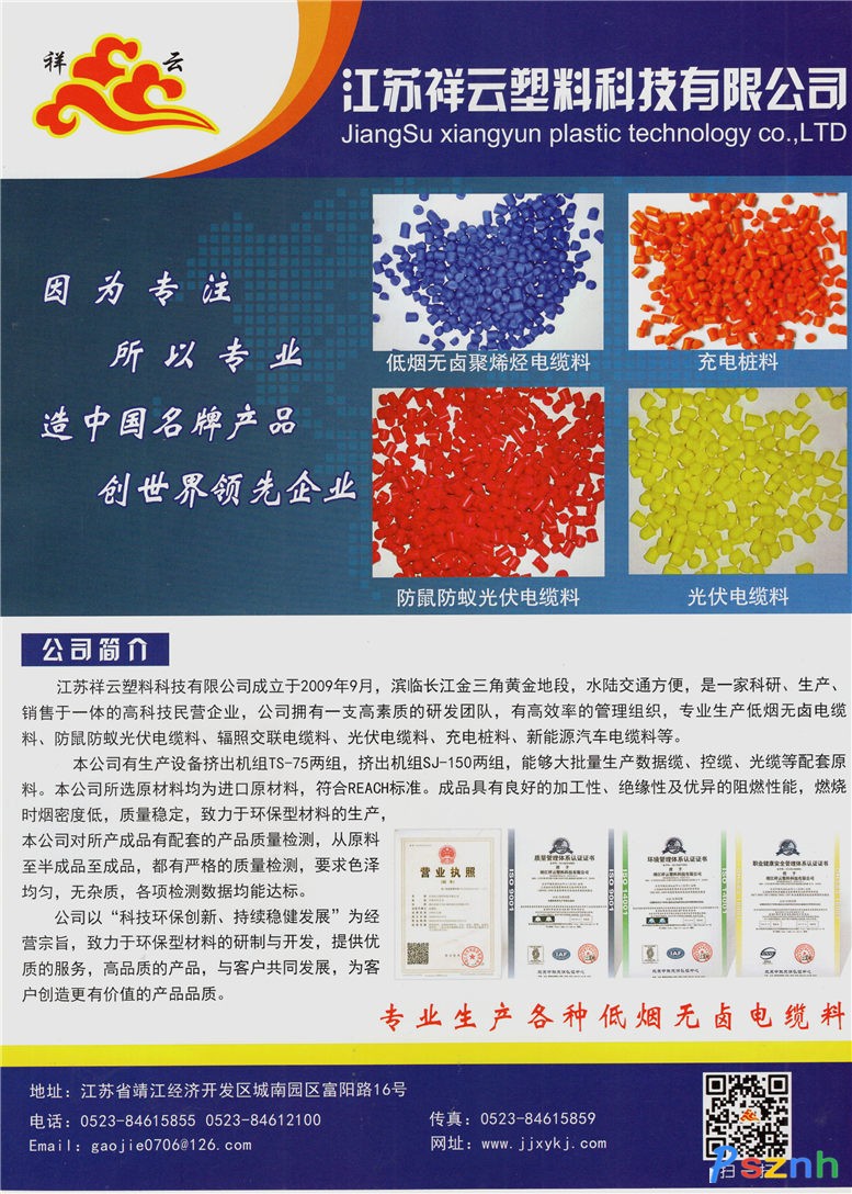 | 經營范圍: | 塑料粒料、電纜粒料研究、開發、制造、銷售;電線電纜銷售。(依法須經批準的項目,經相關部門批準后方可開展經營活動) | ||