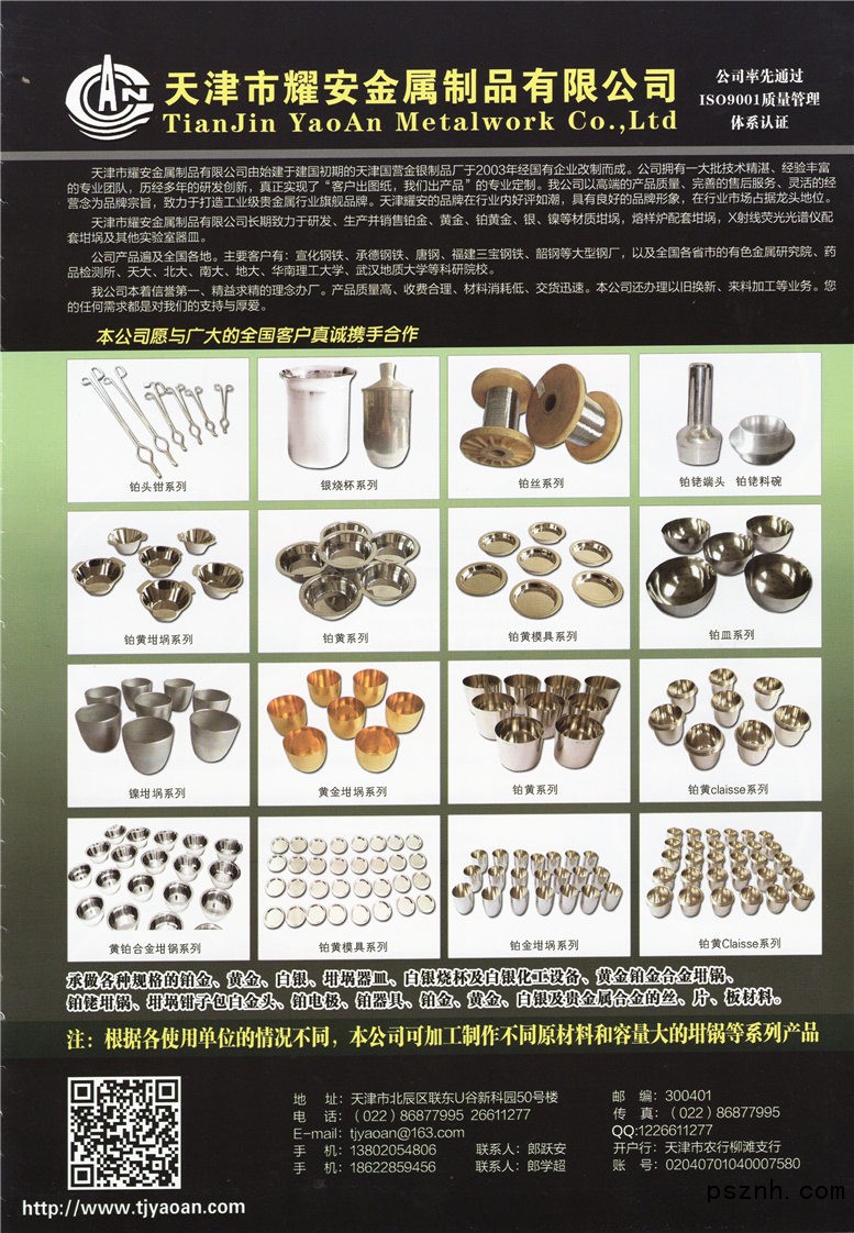 | 經營范圍: | 鉑金制品、鉑黃金制品、銀制品、鉑銠制品、鐵制品、鎳制品制造、加工、銷售,工藝品加工,五金產品、儀器儀表、化工產品批發兼零售。(依法須經批準的項目,經相關部門批準后方可開展經營活動) | ||