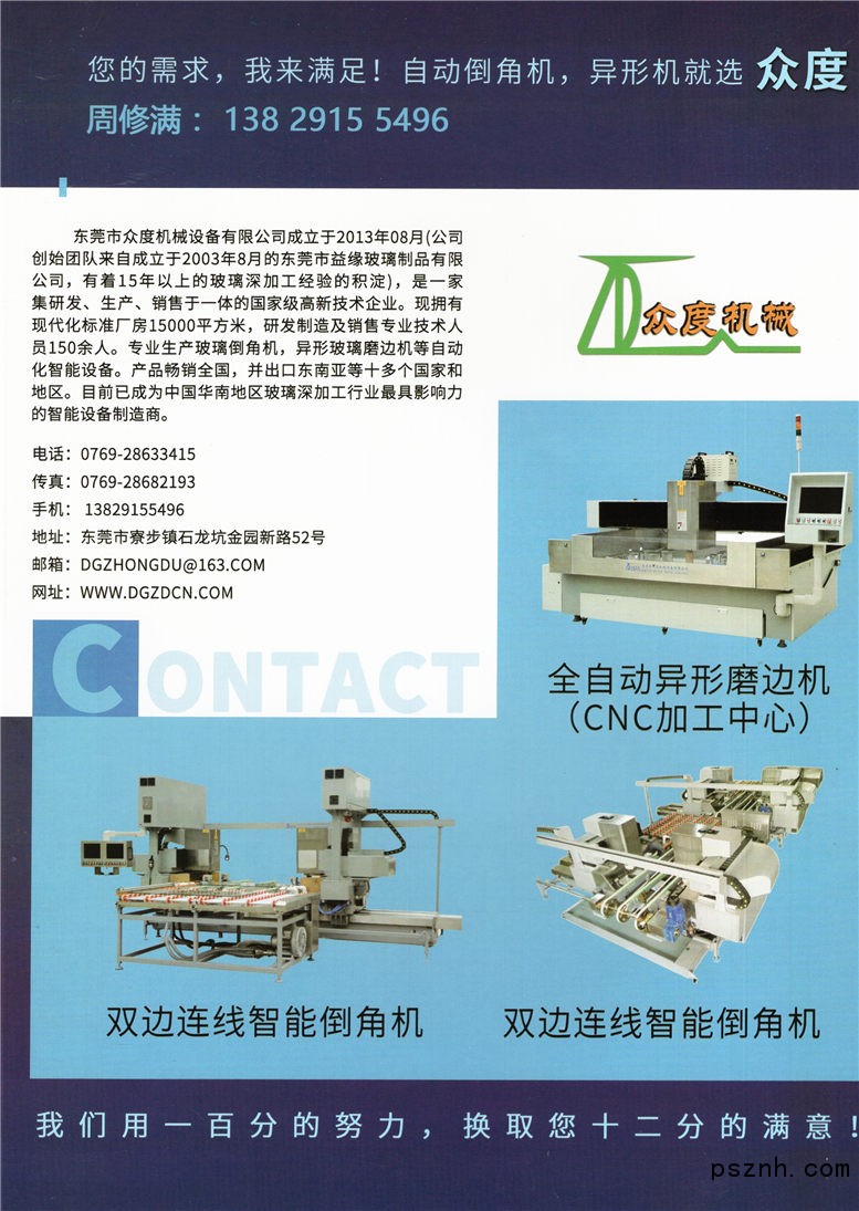 東莞市眾度機械設備有限公司 全自動玻璃倒角機_全自動雙工位玻璃倒角機_CNC異形玻璃磨邊機點擊:344 查看原圖![]() ![]() ![]() 東莞市眾度機械設備有限公司