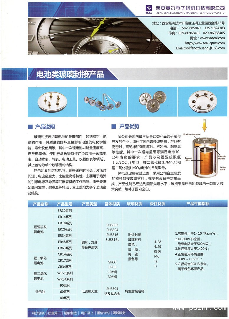 西安賽爾電子材料科技有限公司 一次柱式鋰電池絕緣端子、熱電池用玻璃封接蓋組產品、多針玻璃密封連接器產品、光電玻璃/陶瓷封裝產品、點擊:1212 查看原圖![]() ![]() ![]() 公司地址:西安經濟技術開發區涇渭工業園西金路15號