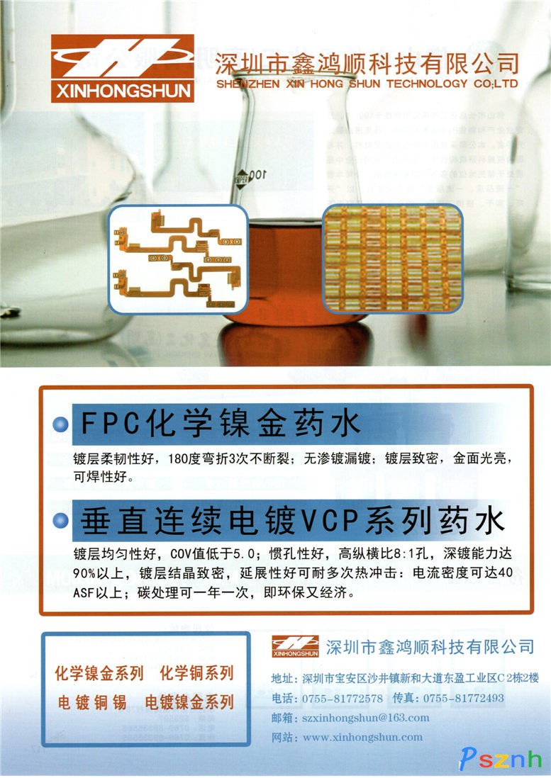 深圳市鑫鴻順科技有限公司_垂直連續電鍍VCP線專用系列藥水_電鍍線用硫酸銅溶液_化學鎳金工藝點擊:591 查看原圖![]() ![]() ![]() 地址:深圳市寶安區沙井新和大道東盈工業園C2棟2樓
