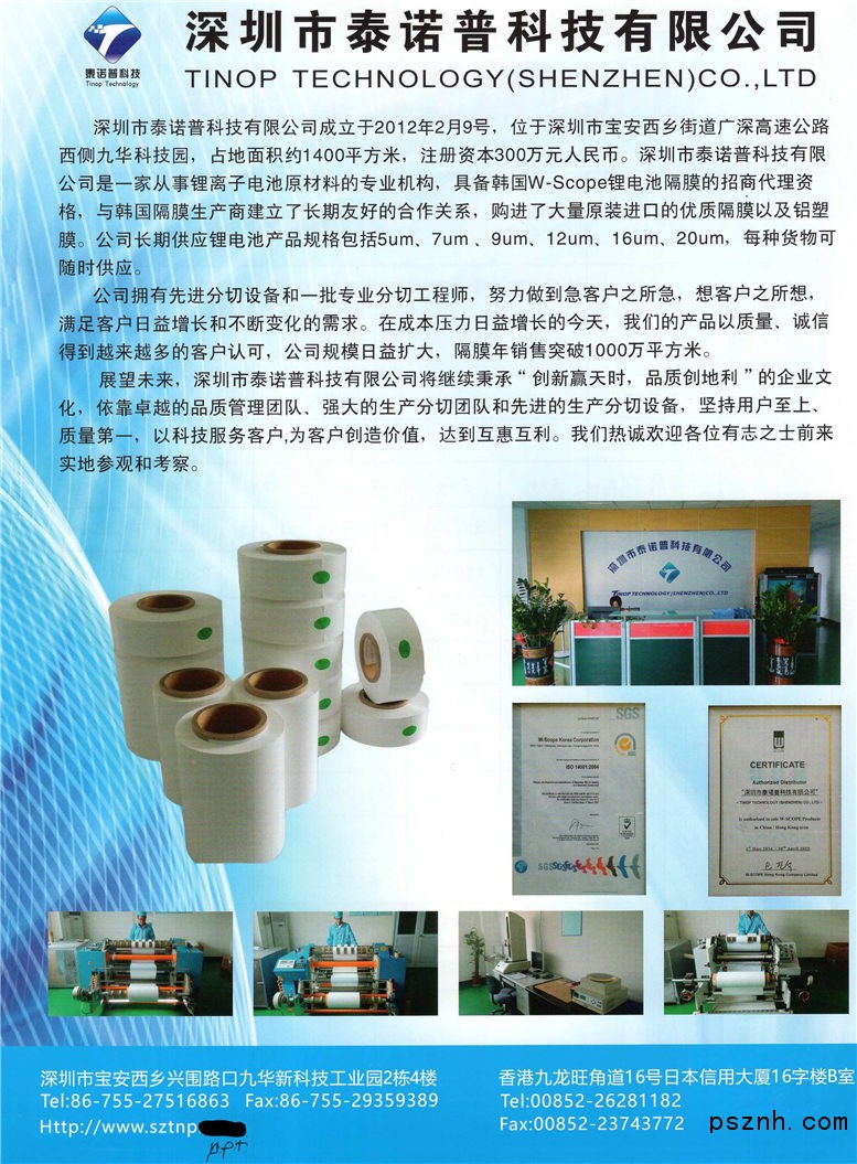 深圳市泰諾普科技有限公司 鋰電池隔膜紙 鋁塑膜 改性無紡布隔膜點(diǎn)擊:607 查看原圖![]() ![]() ![]() 咨詢熱線