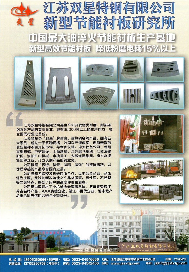 江蘇雙星特鋼有限公司 耐磨鋼襯板_立磨輥皮_耐熱碳鋼系列點擊:404 查看原圖![]() ![]() ![]() 江蘇雙星特鋼有限公司