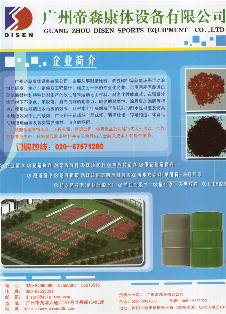 廣州帝森康體設備有限公司 無溶劑全塑型自結紋塑膠跑道 復合型塑膠跑道 混合型塑膠跑道點擊:561 查看原圖![]() ![]() ![]() 公司名稱:廣州帝森康體設備有限公司