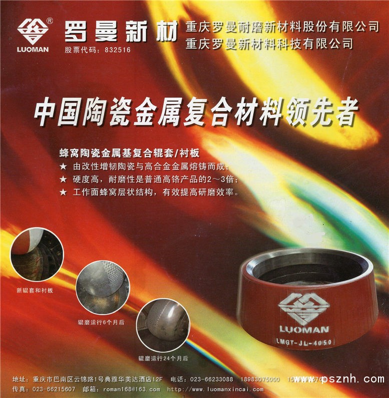 重慶羅曼新材料科技有限公司 陶瓷金屬復合耐磨輥套/襯板 陶瓷金屬復合錘頭 復合耐磨鋼板 陶瓷耐磨管道點擊:870 查看原圖![]() ![]() ![]() 電話:86-023-66233088 | 傳真:86-023-66215607 地址:重慶市巴南區云錦路1號典雅華美達酒店12F
