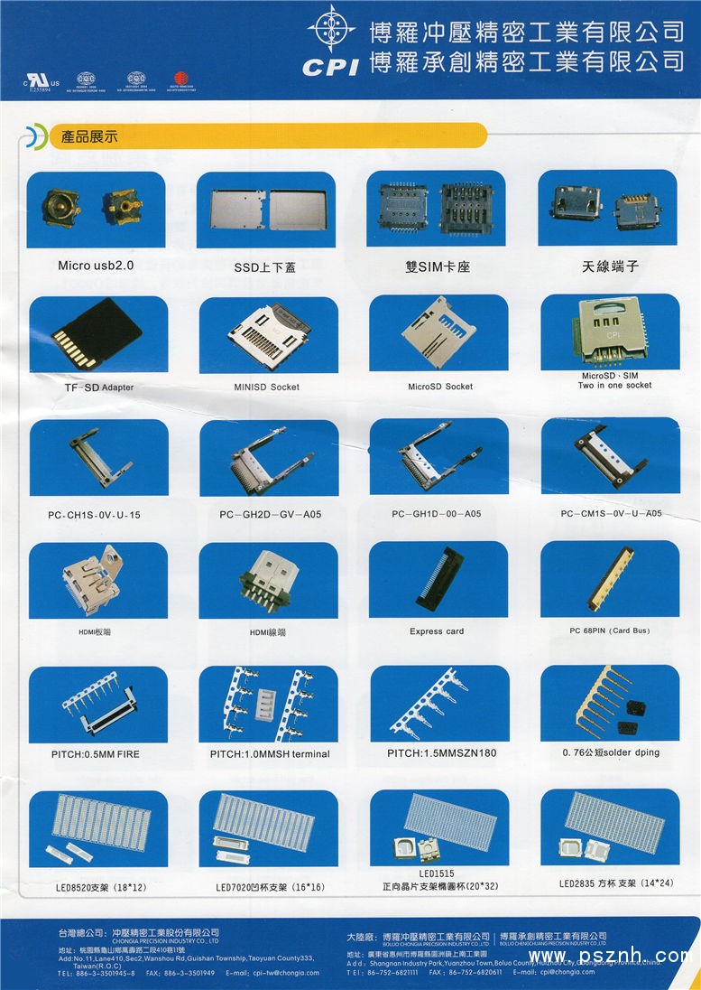 | 公司簡介: | 博羅沖壓精密工業有限公司于1985年7月成立于臺北新莊,2001年4月在大陸設廠,成立博羅沖壓精密工業有限公司,2006年成立博羅承創精密工業有限公司,并以自創品牌CPI專注生產精密沖模塑模、LED支架、端子、薄膜開關、高頻連接器、記憶卡卡座。公司于2002年11月首次通過ISO9001認證,2004年8月首次通過ISO14001認證,2011年3月通過IATF16949認證。經驗豐富的研發團隊,采用計算機輔助設計,積極開拓,大膽創新,及時滿足市場和客戶的要求。![]() 我們的產品有:LED支架、端子系列、高頻連接器系列、2.54Din連接器、HDMI系列、五金彈片(鍋仔片)、記憶卡卡座系列,年營業額成增長趨勢。為滿足客戶緊急送貨要求,公司擁有自己的車隊及時送貨,完善的管理體制為您提供合格的高端產品。 沖壓精密工業股份有限公司(總公司) 業務聯絡人:0912828502 業務外貿: 高小姐 18026622778 郵箱:J010@chongia.com 林小姐 13829933447 郵箱:emily@chongia.com 林先生 13829933447 郵箱:steven@chongia.com |
