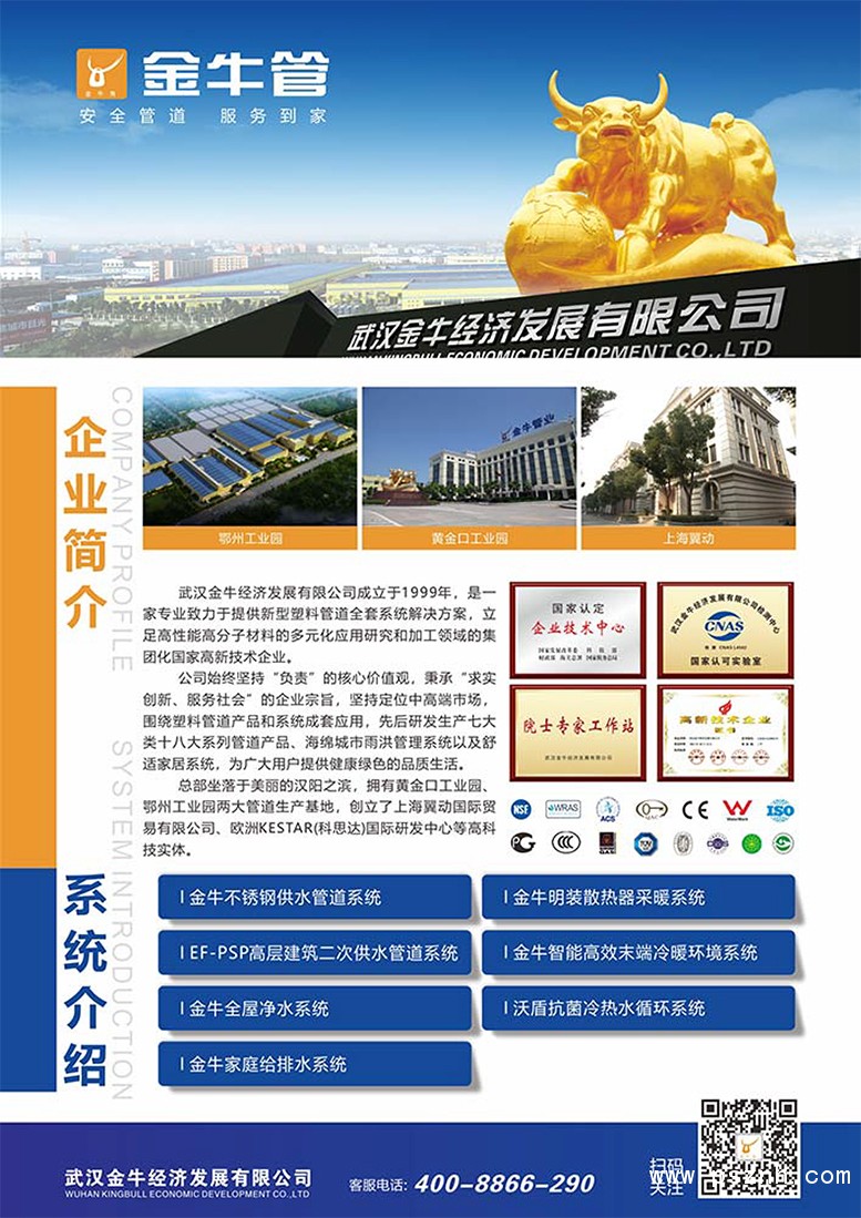 | 公司簡介: | 武漢金牛經濟發展有限公司成立于1999年,是一家專業致力于提供新型塑料管道全套系統解決方案,立足高性能高分子材料的多元化應用研究和加工領域的集團化國家高新技術企業。