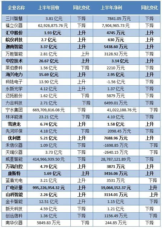 近日,三川智慧、福立儀器、匯中股份、皖儀科技、迦南智能、寧水集團、林洋能源、科陸電子等30家儀表企業發布了2022年上半年業績報告,其中11家實現營收和凈利潤雙增長,14家營收和凈利潤雙下降,5家增收不增利。