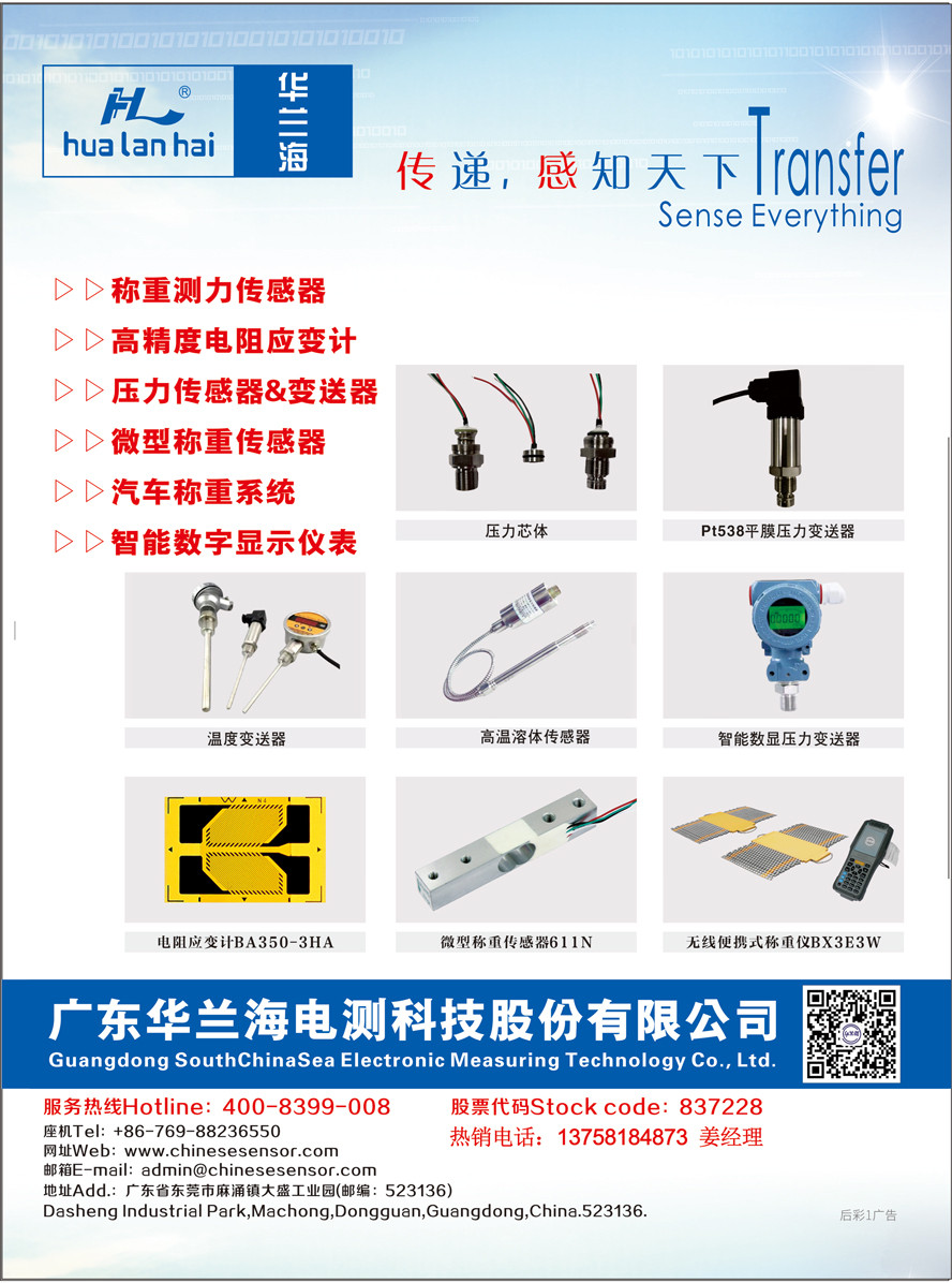 廣東華蘭海電測(cè)科技股份有限公司(原東莞市華蘭海電子有限公司)成立于2003年,是一家自主研發(fā)和生產(chǎn)高精度電阻應(yīng)變計(jì)、應(yīng)變式測(cè)力稱重傳感器、彎板式稱重傳感器、公路計(jì)重收費(fèi)系統(tǒng)、便攜式汽車軸重儀、壓力傳感器/變送器等電測(cè)類產(chǎn)品以及智能健康軟硬件產(chǎn)品的多元化高新技術(shù)企業(yè)。 公司于2016年5月成功掛牌“新三板”,代碼837228。自掛牌上市以來(lái),公司步入快速成長(zhǎng)階段,集團(tuán)化發(fā)展方向明確。 作為稱重測(cè)力傳感器上市廠家華蘭海電測(cè)經(jīng)過(guò)層層篩選和考慮最終選擇了儀表行業(yè)專業(yè)媒體《儀表與測(cè)量控制》雜志入刊刊登廣告!
