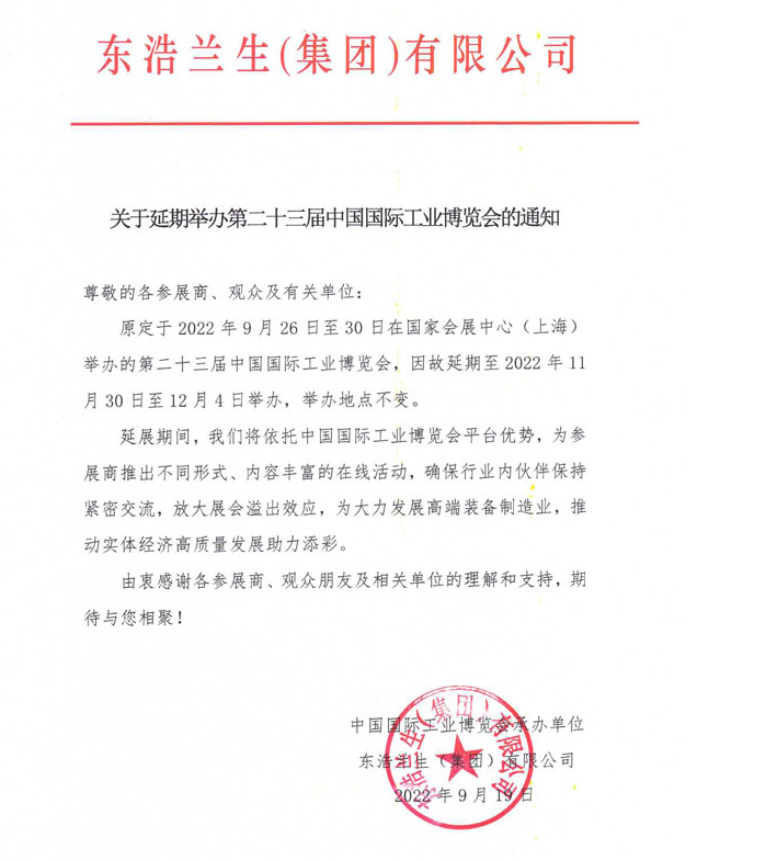 原定于2022年9月26日至30日在國家會展中心(上海)舉辦的第二十三屆中國國際工業博覽會,因故延期至2022年11月30日至12月4日舉辦,舉辦地點不變。