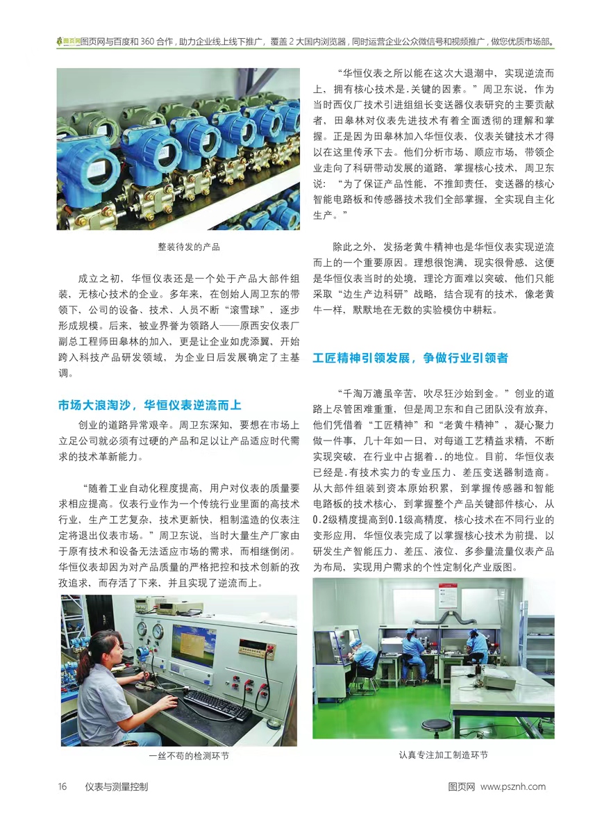 “隨著工業自動化程度提高,用戶對儀表的質量要求相應提高。儀表行業作為一個傳統行業里面的高技術行業,生產工藝復雜,技術更新快,粗制濫造的儀表注定將退出儀表市場。”周衛東說,當時大量生產廠家由于原有技術和設備無法適應市場的需求,而相繼倒閉。華恒儀表卻因為對產品質量的嚴格把控和技術創新的孜孜追求,而存活了下來,并且實現了逆流而上。