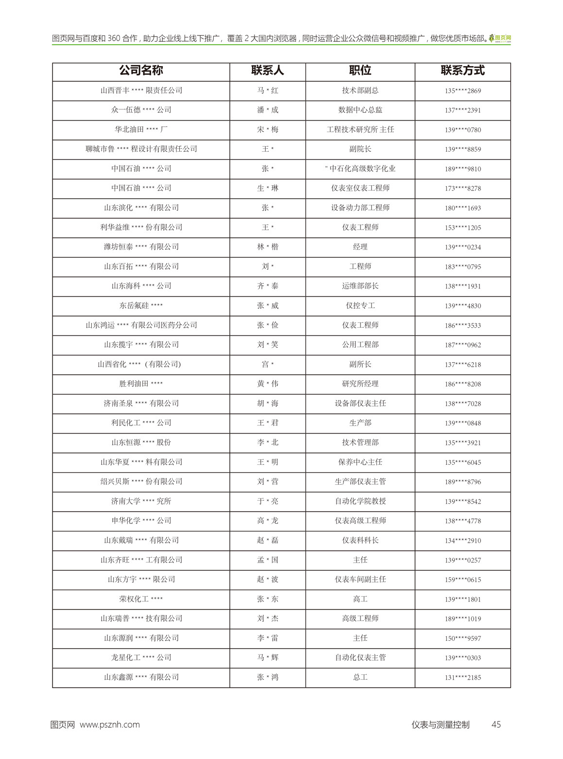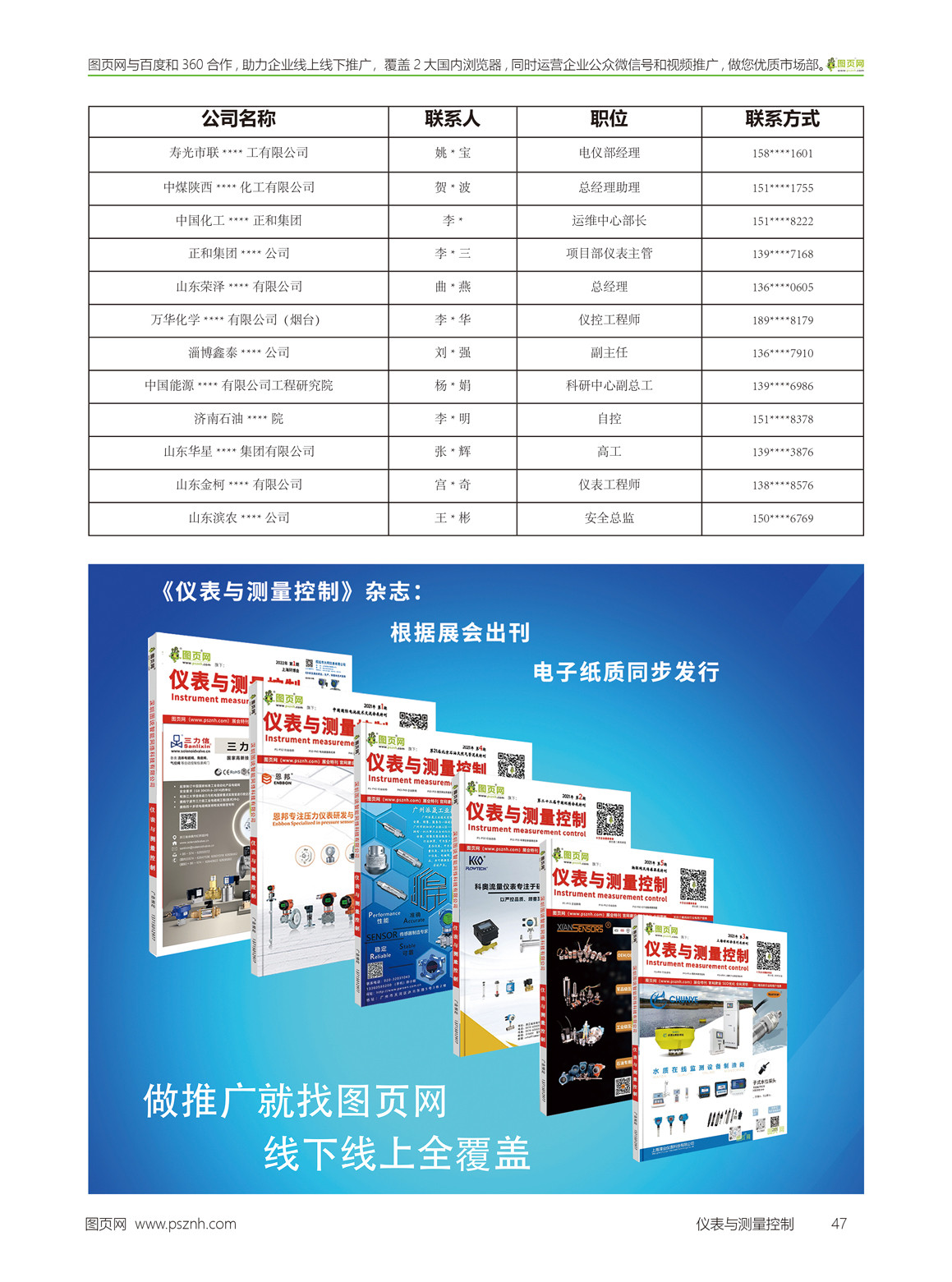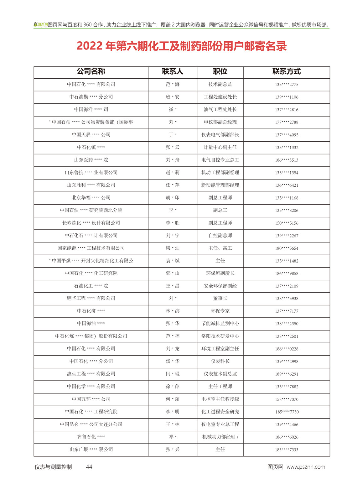 石化與制藥企業(yè)部份郵寄儀表采購商錄2022年第六期《儀表與測量控制》,2022年全年六刊已出刊完畢。現(xiàn)將《儀表與測量控制》雜志2022年第六期現(xiàn)將電子刊發(fā)您。您留下您的聯(lián)系地址聯(lián)系人,近期的紙質(zhì)版將給您免費寄過來(急需要紙刊需到付)內(nèi)面有部份郵寄儀表采購商錄!
