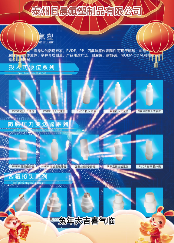 兔年大吉喜氣臨,昂首擺尾迎春來。新春佳節即將到來,我謹代表泰州日晨氟塑制品有限公司向大家致以新春的祝福和誠摯的問候!日晨氟塑制品有限公司專注于各種氟塑制品,如四氟溫度傳感器系列、各類防腐儀表配件接頭PP、PVDF,四氟131、2088系列,投入式液位系列、防腐壓力變送器系列,四氟墊片,非標定制等產品生產制造,獲得用戶一致好評。