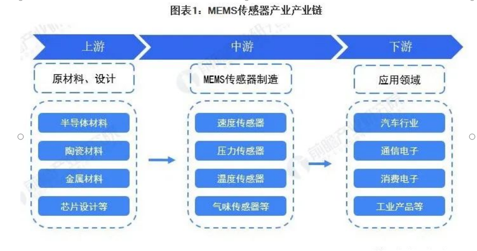 ⒈MEMS傳感器產業產業鏈全景梳理:MEMS傳感器應用廣泛從產業鏈環節來看,MEMS傳感器產業的上游產業鏈包括原材料、芯片設計等。MEMS傳感器材料分半導體材料、陶瓷材料、金屬材料和有機材料四大類。下游應用與工業、汽車電子產品、通信電子產品、消費電子產品、專用設備等相關聯。整體來看,MEMS傳感器產業上下游所涉及的領域范圍非常廣泛。