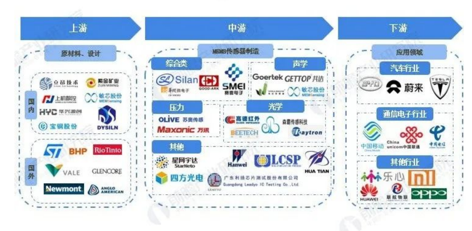 目前,我國MEMS傳感器上游原材料企業包括:立昂微(605358)、滬硅產業(688126)、上機數控(603185)、寶鋼股份(600019)等,國外企業包括巴西淡水河谷公司、澳大利亞必和必拓公司等。中游企業包括:士蘭微(600460)、賽微電子(300456)、華潤微(688396)、蘇州固锝(002079)、韋爾股份(603501)、歌爾股份(002241)和共達電聲(002655)等企業。下游應用領域包括:比亞迪(002594)、樂心醫療(300562)和小米集團(01810.HK)等