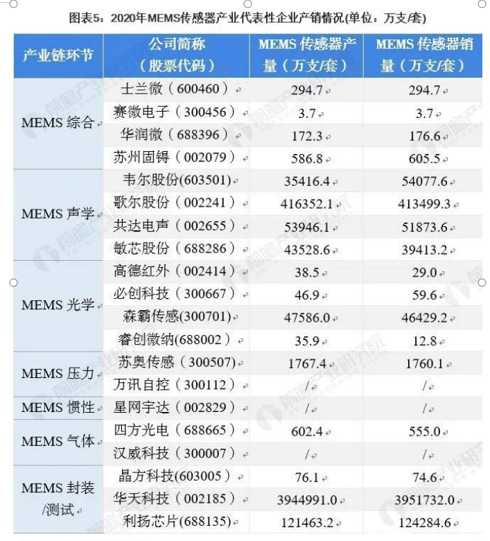 ⒊MEMS傳感器產業代表性企業產銷情況目前,布局了MEMS傳感器業務的上市企業中,歌爾股份(002241)在MEMS傳感器產銷規模方面處于優勢地位(雖披露口徑為電子元器件,但鑒于公司主營MEMS傳感器業務,故數據具有一定的參考性)。MEMS傳感器產業產業鏈上的其它代表性企業產銷情況如下:注:①統計的企業為公布相關產銷數據的上市企業,未公布具體產銷數據的上市企業未納入統計中;②歌爾股份、士蘭微的產銷數據披露口徑分別為電子元器件和集成電路產品