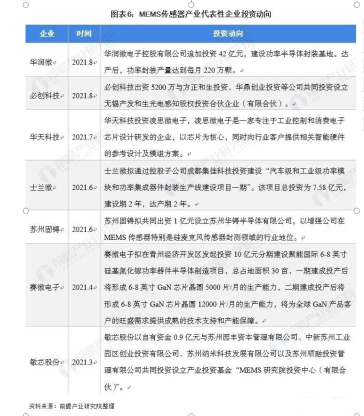 ⒋MEMS傳感器產業代表性企業最新投資動向2021年以來,MEMS傳感器產業代表性企業的投資動向主要包括收購公司拓展業務、通過對子公司增資的方式投資MEMS傳感器生產基地項目。MEMS傳感器產業代表性企業最新投資動向如下: