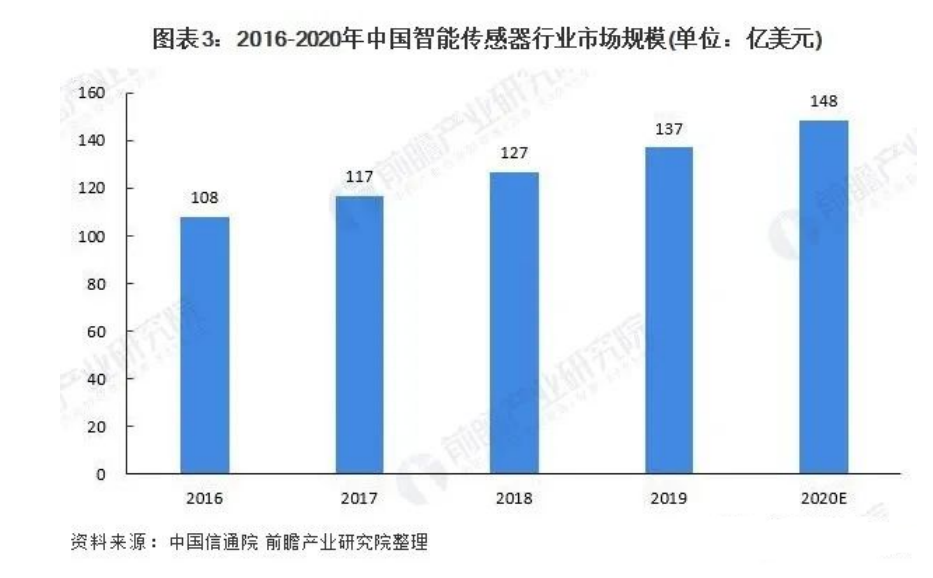 ⒊中國智能傳感器市場規模持續上升根據中國信通院的數據,中國智能傳感器市場規模從2015年的106億美元上升至2019年的137億美元,我國智能傳感器產業生態逐漸趨于完備,設計制造,封測等重點環節均有骨干企業布局。2020年,中國智能傳感器行業市場規模在148億美元左右。