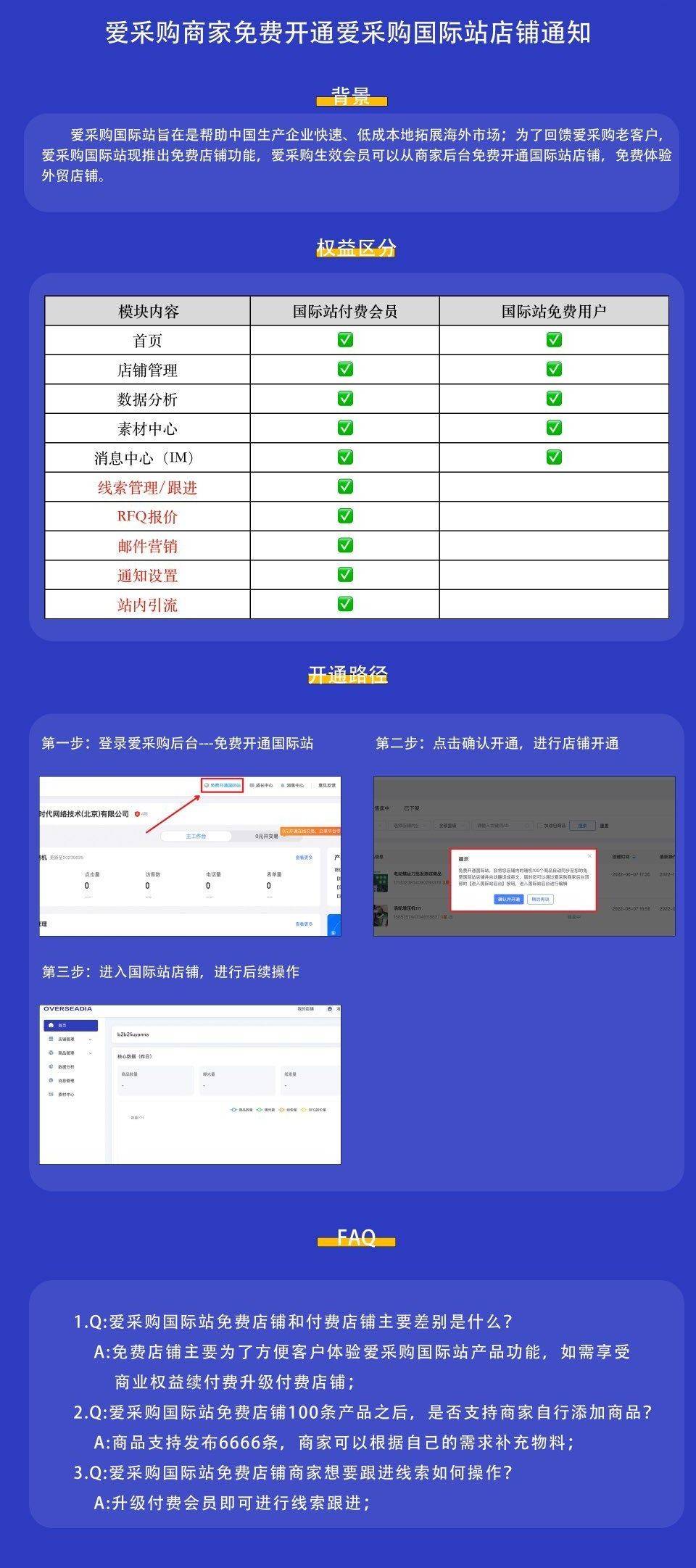 1. 免費開通:只限已開通愛采購店鋪會員的企業,沒有開通國內愛采購的企業需要開通國內愛采購,開戶是6980元/年。免費開通的權益包括發布產品信息、展示企業信息、與海外買家進行溝通等基本功能,使企業可以獲得基本的曝光和推廣。