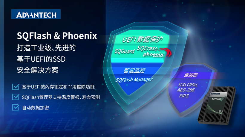 研華與BIOS固件專家Phoenix合作推出基于UEFI(Unified Extensible Firmware Interface統(tǒng)一可擴(kuò)展固件接口)的SSD安全軟件工具--SQErase。SQErase旨在開(kāi)創(chuàng)數(shù)據(jù)安全的未來(lái),可通過(guò)UEFI刪除關(guān)鍵數(shù)據(jù),不受操作系統(tǒng)的限制,為堅(jiān)固耐用型工業(yè)應(yīng)用提供了全面的存儲(chǔ)安全解決方案。研華SSD SQFlash系列產(chǎn)品為軍事、金融、醫(yī)療保健、交通和政府應(yīng)用提供了更高的安全性和可靠性。