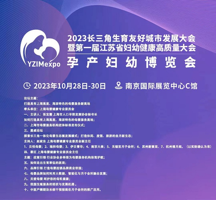 2023 年是全面貫徹落實黨的二十大精神的開局之年, 也是全面推進健康中國戰略實施、推動中國式 現代化高質量發展的關鍵一年,為加強長三角地區婦幼健康領域的學術交流,促進婦幼健康相關一體化 協同合作,推進長三角地區婦幼健康事業優勢互補、協同發展,加快構建長三角一體化背景下婦幼健康 事業發展新格局,由江蘇省衛生健康委員會指導,新華日報健康傳媒中心聯合江蘇省婦幼健康研究會、 江蘇省婦幼保健院共同主辦 2023 長三角生育友好型城市發展峰會 暨國際孕產婦幼高質量發展博覽會擬 于 2023 年 10 月 28 日 —— 10 月 30 日在南京新莊國際博覽中心舉行,通過峰會的舉辦,全方位立體化 展現江蘇以及長三角地區婦幼健康事業發展成果,展示婦幼保健和產康服務領域的最新研發項目和尖端 產品, 打造專業交流平臺, 凝聚合力、匯聚智慧, 進一步拓展延伸婦幼健康服務和科普工作的深度和廣度, 攜手推動婦幼健康高質量發展,為提升長三角地區婦幼健康水平,提高全民健康素養做出更大貢獻。