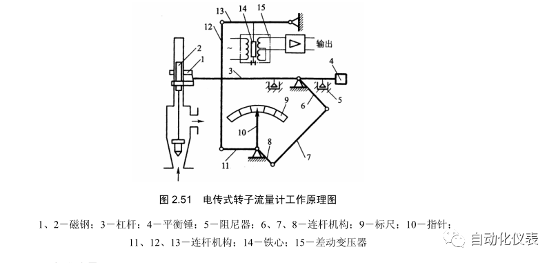 上面所介紹的轉(zhuǎn)子流量計只適用于就地指示,對配有電遠(yuǎn)傳裝置的轉(zhuǎn)子流量計,可以將反映流量大小的轉(zhuǎn)子高度 h 轉(zhuǎn)換為電信號,傳送到其他儀表進(jìn)行指示、記錄和控制。圖2.51 為電傳式轉(zhuǎn)子流量計的工作原理圖。當(dāng)流體流量變化時使轉(zhuǎn)子轉(zhuǎn)動,磁鋼 1 和 2 通過帶動杠桿 3 及連桿機構(gòu) 6 、 7 、 8 使指針 10 在標(biāo)尺 9 上就地指示流量。與此同時,差動變壓器檢測出轉(zhuǎn)子的位移,產(chǎn)生差動電勢通過放大和轉(zhuǎn)換后輸出電信號,通過顯示儀表顯示和通過控制儀表進(jìn)行調(diào)節(jié)。