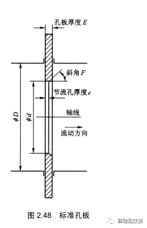 節(jié)流裝置就是使管道中流動的流體產(chǎn)生靜壓力的裝置,完整的節(jié)流裝置由節(jié)流元件、取壓裝置和上下游測量導(dǎo)管 3 部分組成,有標(biāo)準(zhǔn)節(jié)流裝置和非標(biāo)準(zhǔn)節(jié)流裝置兩大類。對于標(biāo)準(zhǔn)節(jié)流裝置,在設(shè)計計算時都有統(tǒng)一的標(biāo)準(zhǔn)規(guī)定、要求和計算所需的有關(guān)數(shù)據(jù)及程序,可直接按照標(biāo)準(zhǔn)制造;安裝和使用時不必進(jìn)行標(biāo)定,能保證一定的精度。非標(biāo)準(zhǔn)節(jié)流裝置主要用于特殊介質(zhì)或特殊工況條件的流量檢測,它必須用實驗方法單獨標(biāo)定。作為流量檢測用的節(jié)流元件有標(biāo)準(zhǔn)的和特殊的兩種。標(biāo)準(zhǔn)節(jié)流元件包括標(biāo)準(zhǔn)孔板、標(biāo)準(zhǔn)噴嘴和標(biāo)準(zhǔn)文丘里管。標(biāo)準(zhǔn)孔板是用不銹鋼或其他金屬材料制造的薄板,具有圓形開孔并與管道同心,其直角入口邊緣非常銳利,且相對于開孔軸線是旋轉(zhuǎn)對稱的,順流的出口呈擴散的錐形,如圖 2.48 所示。對標(biāo)準(zhǔn)孔板的特征尺寸要求為:節(jié)流孔徑 d 不小于 12.5mm ,直徑比 d/D 應(yīng)在 0.2 ~ 0.75 之間, D 為管道直徑,直孔厚度 h 應(yīng)在 0.005D ~ 0.02D 之間,孔板的總厚度 H應(yīng)在 h ~ 0.05D 之間,圓錐面的斜角α應(yīng)在 30 °~ 45 °之間。