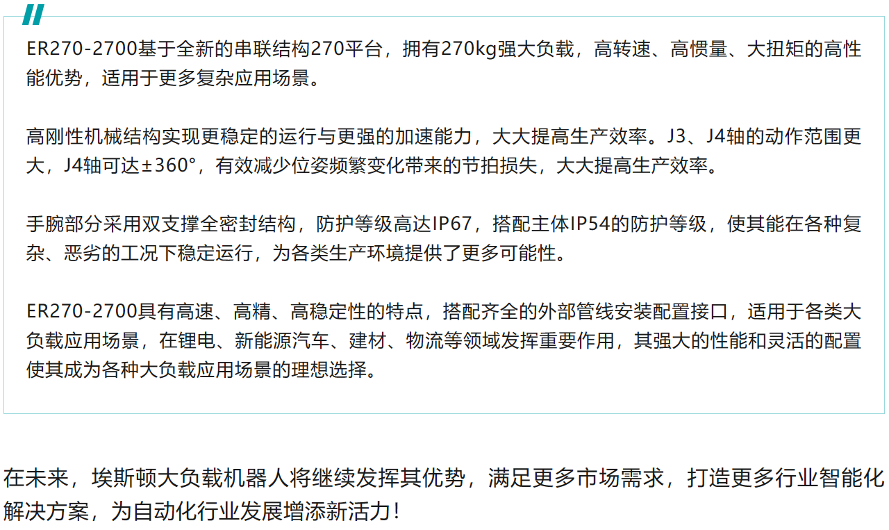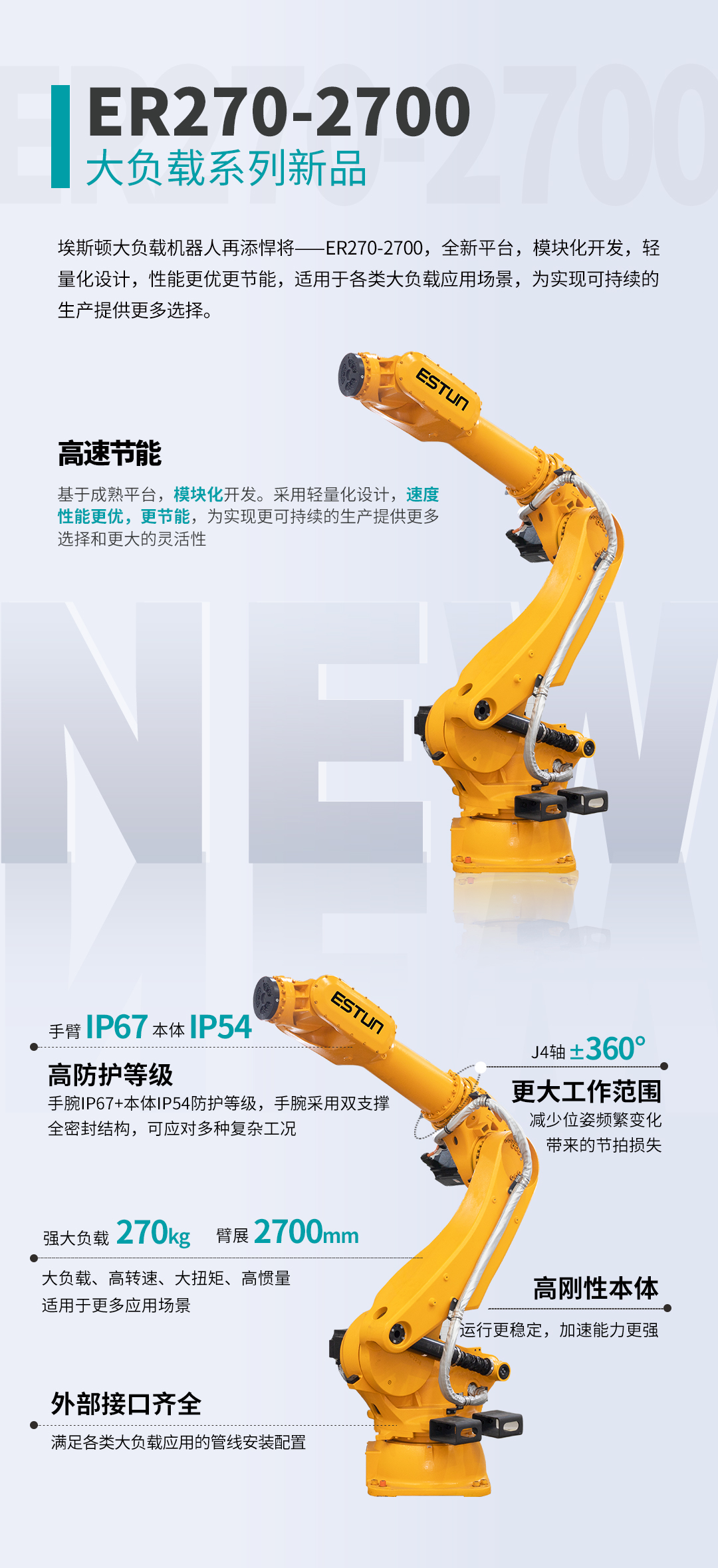 隨著鉀電、新能源汽車等行業的迅猛發展,大負載機器人的需求和應用場景也在不斷拓寬。作為中國機器人領軍品牌,埃斯頓的大負載機器人系列已經在鯉電、汽車、建材、物流等領域得到了廣泛應用。為了更好地滿足客戶需求,埃斯頓大負載機器人再添悍將ER270-2700