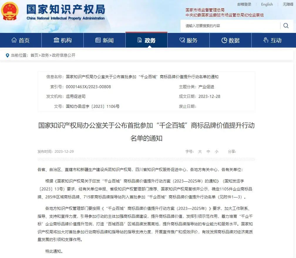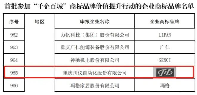 近日,國家知識產權局發布《關于公布首批參加“千企百城”商標品牌價值提升行動名單的通知》,重慶川儀自動化股份有限公司(以下簡稱“川儀股份”或“公司”)所持川儀商標成功入選并通過公示,被確定為首批參加“千企百城”商標品牌價值提升行動的企業商標品牌。