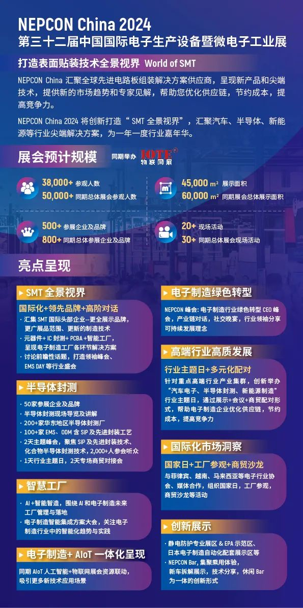 NEPCON China 2024將呈現多個新亮點,包括SMT全景視界的國際化+品牌齊聚+高階對話,半導體封測、智慧工廠、電子制造與AIoT一體化解決方案的展示,電子制造綠色轉型、高端行業高質量發展、國際化市場洞察等。