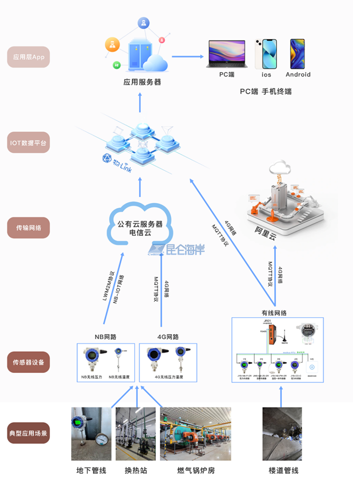 本項目是根據北京智慧供熱要求,對區域重點供暖鍋爐房和換熱站進行智能運行管理。項目中采用NB無線壓力傳感器為主要的監控設備,4G無線傳感器作為補充,對于具備直流供電的樓宇管道則可以采用網關集中采集上報的方式來監測供暖管路中供/回水壓力,根據壓力變化來判斷供暖管路系統的安全性和供暖循環泵的運行狀態;采用NB/4G無線溫度傳感器,監測供暖管路中供/回水溫度,根據溫度變化和供/回水的溫差來調節燃氣鍋爐的燃燒狀態和出水溫度,達到節能減排的目的;采用NB/4G無線液位傳感器,監測鍋爐熱水補水箱的水位變化,如果水箱水位較低可以報警提示并開啟電動閥門補水,達到智能控制的目的。 通過對供暖溫度的監控,降低了能耗避免資源浪費,對于供熱不足的區域提高了供暖溫度, 提高了用戶的滿意度。