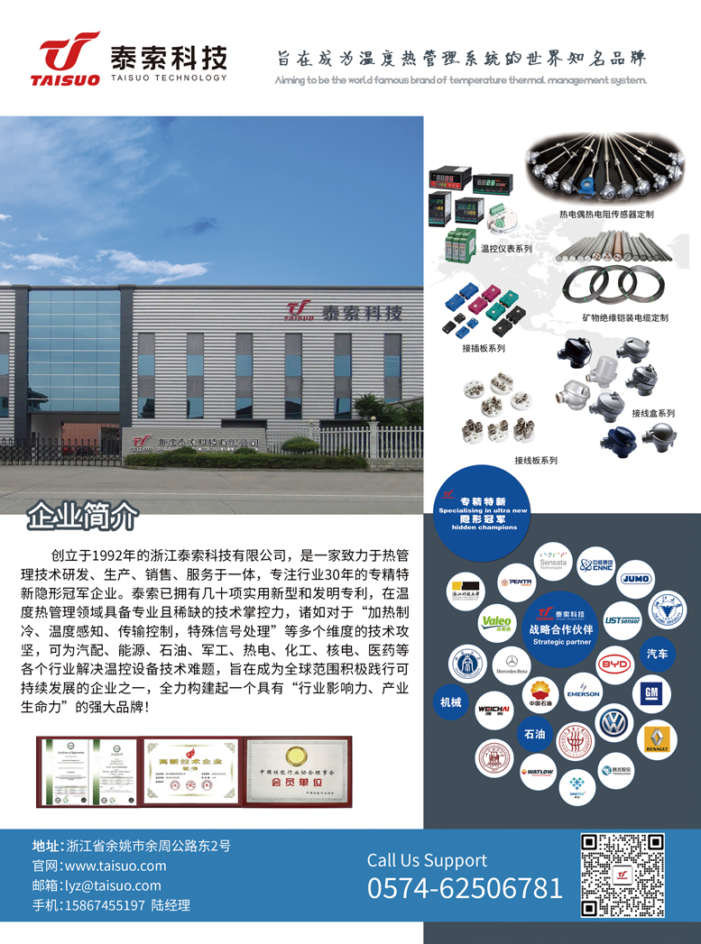 在此次世環會中,浙江泰索科技有限公司作為溫度熱管理系統的領軍企業,借助《儀表與測量控制》雜志的平臺,成功展示了其在溫度控制領域的先進技術和解決方案。自1992年成立以來,泰索科技始終專注于溫度熱管理系統的研發與創新,致力于為全球溫度控制領域相關產業的可持續發展做出貢獻。泰索科技擁有多項實用新型和發明專利,與國內高等院校導師、材料學院教授、研究院專家等進行長期合作研發,在熱管理前沿技術領域取得了豐碩成果,為公司帶來了長期可持續增長的發展動力。公司在溫度熱管理領域具備專業且稀缺的技術掌控力,諸如“加熱制冷、溫度感知、傳輸控制,特殊信號處理”等多個維度的技術攻堅,可為汽配、能源、石油、軍工、熱電、化工、核電、醫藥等各個行業解決溫控設備技術難題。泰索科技的發展圍繞“制造工業、汽車工業、特種行業、品質生活”四大核心模塊,產品包括溫度傳感器、溫控儀表、汽車尾氣傳感器核心部件、加長鎧裝測溫電纜、超長信號電纜、高端加熱電纜、新能源汽車電流傳感器等。通過對產品鏈條的豐富迭代以及比肩國際水準的技術實力,泰索科技成為了世界五百強企業和中國央企的長期合作供應商,其足跡遍布全球各地,不斷刷新在行業細分領域的變革目標,成為溫度熱管理細分領域的領軍企業。