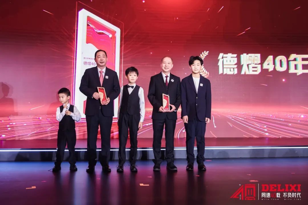 慶典前夕,德力西也為集團所有入職超過20年的在職老員工制作了紀念獎杯,因人數(shù)眾多,僅在晚宴現(xiàn)場為部分老員工代表頒獎。德力西集團高級副總裁、杭州德力西集團董事長包秀杰為胡成虎等20年以上司齡的老員工代表頒發(fā)了“德輝20年”獎杯。胡成國為包秀東等30年以上司齡的老員工代表頒發(fā)了“德耀30載”獎杯。代表第三代德力西人的小朋友,為集團兩位創(chuàng)始人胡成中、胡成國頒發(fā)了“德熠40年”獎杯。