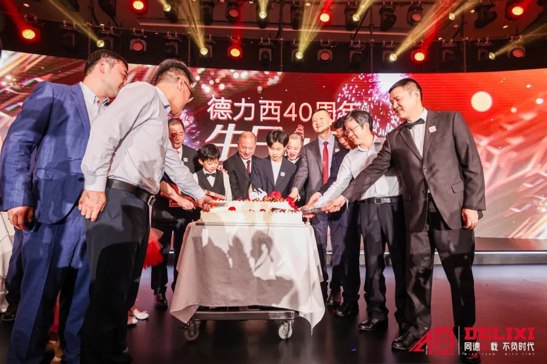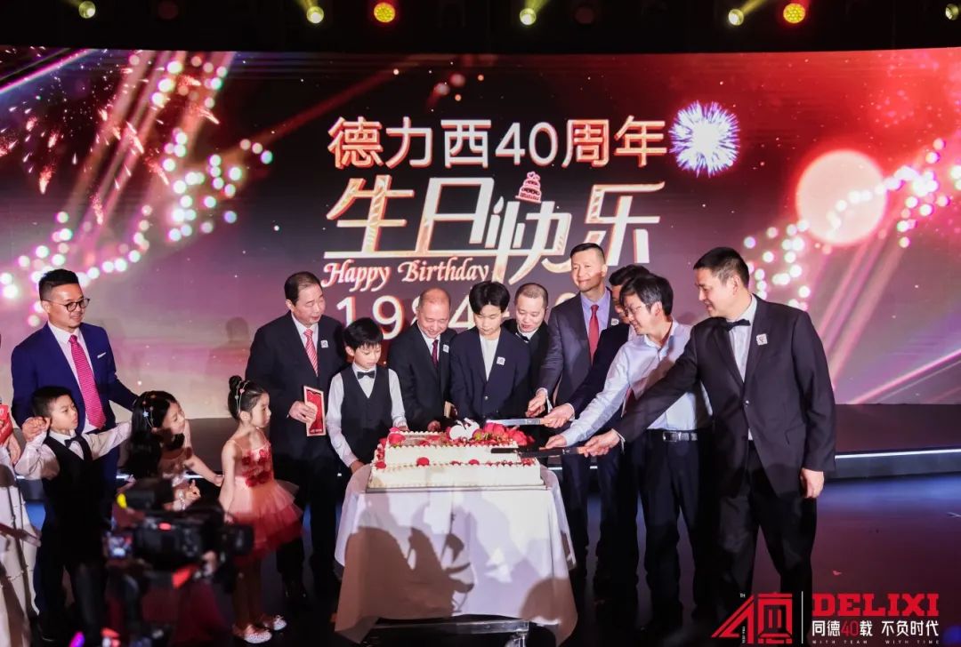 在兩位創(chuàng)始人的見證下,集團與各一級企業(yè)的代表——胡煜鐄、樓峰、張永、包秀杰以及上海德力西集團總裁胡涉琪、甘化科工總裁李忠、德新科技董事長邱嶺、資產(chǎn)集團總裁宣剛、上德環(huán)保總裁于洋共同切開德力西40歲的生日蛋糕。