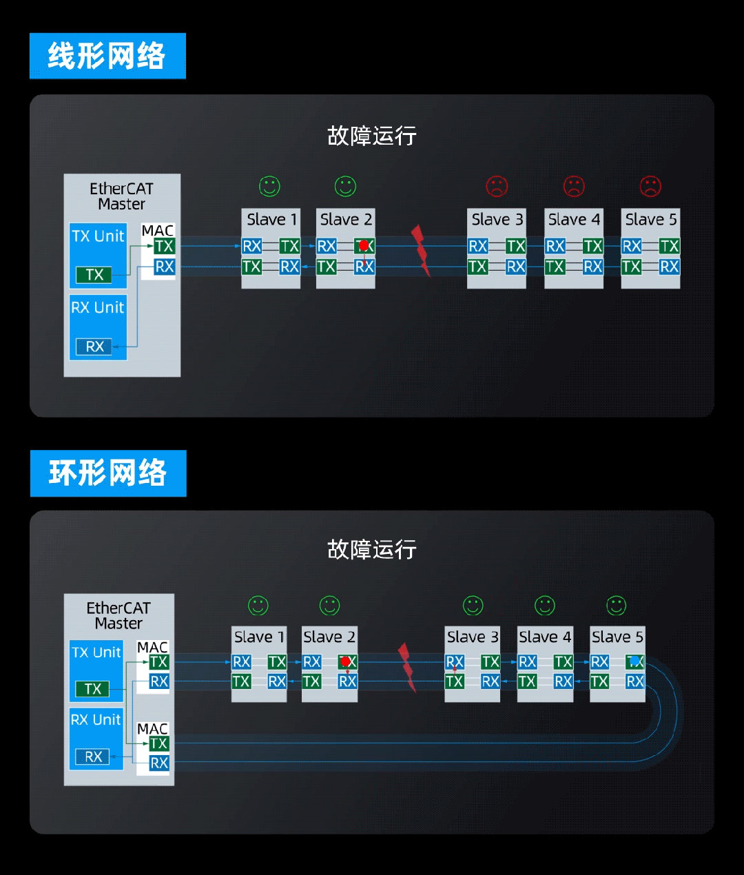 匯川AM760通過EtherCAT主站環形冗余設計:使用雙網卡的環形拓撲結構,即總線發生單點故障,也不影響其他從站的正常運行;故障復位后,系統1秒內完成環網重連,高效“自愈”,為食品冷鏈等對連續性要求極高的生產活動保駕護航。