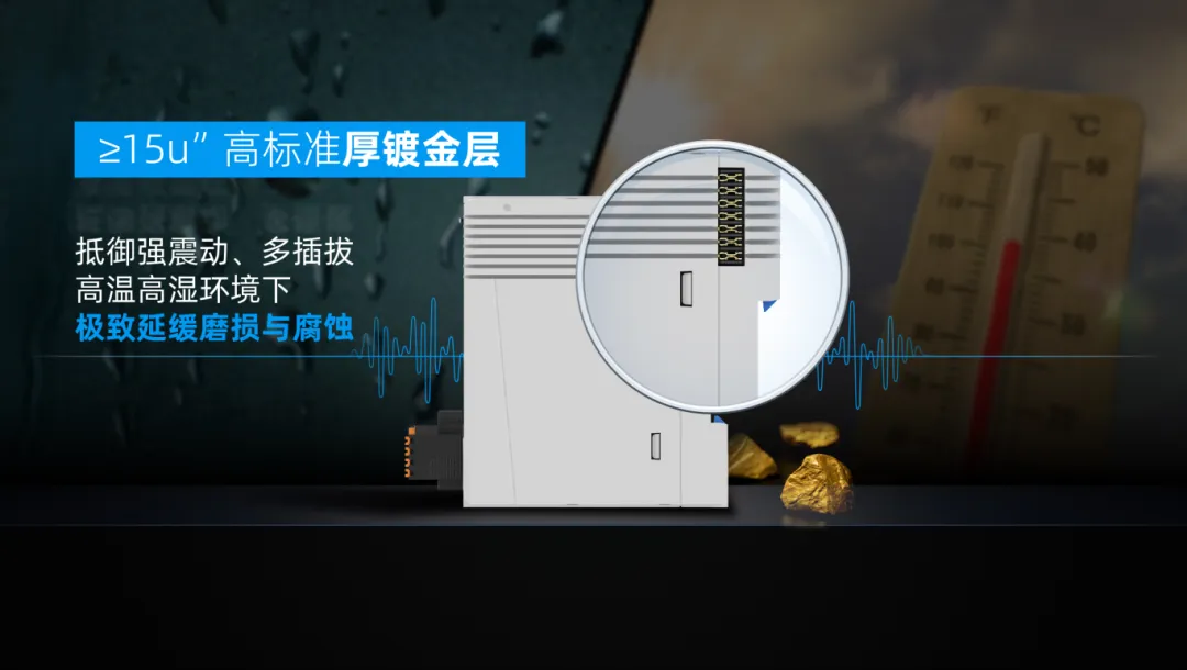 你一定想不到,匯川這款通用型PLC-AM760,是按照適應風機運行工況的標準設計的!從選材用料的角度來看,即便最容易被忽視的連接器,匯川都一律采用15u"以上的高標準厚鍍金層,以極致延緩設備在強震動、多插拔和易氧化環境中的磨損與腐蝕,如食品包裝、瓦楞紙產線等高溫高濕工況,進一步確保控制器長效穩定運行。