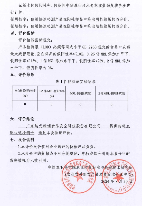 中國農業科學院農業質量標準與檢測技術研究所(農業農村部農產品質量標準研究中心)于2024年8月組織開展了蔬菜中農藥殘留快檢產品評價工作。廣東達元綠洲食品安全科技股份有限公司提供的三唑磷、氯氟氰菊酯、甲氨基阿維菌素苯甲酸鹽、滅多威、氟蟲腈、水胺硫磷、倍硫磷、毒死蜱、甲拌磷、啶蟲脒、克百威和三羥基克百威等11種快速檢測卡參加了本次評價,經實驗驗證和專家復核,11種產品全部通過驗證評價。