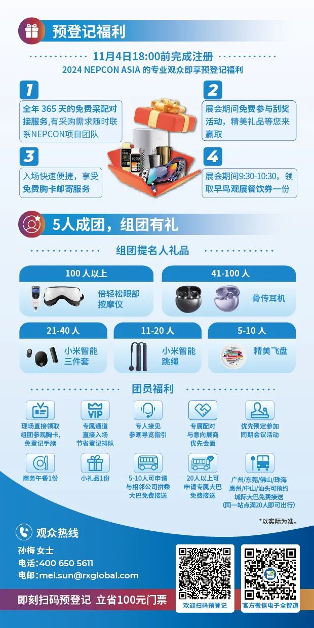 觀眾預登記福利一覽預計600+展商、150+新品首發、40+論壇&賽事點擊組團即刻一站高效式逛展!預登記觀眾現場更有三重禮遇,等你來拿