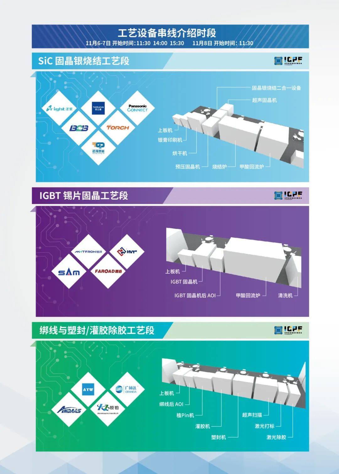 主辦方全新推出了IGBT & SiC模塊封測工藝示范線,薈萃60家半導體封裝測試設備與材料品牌,前沿“芯”設備與工藝融合展示,助力企業實現技術升級!