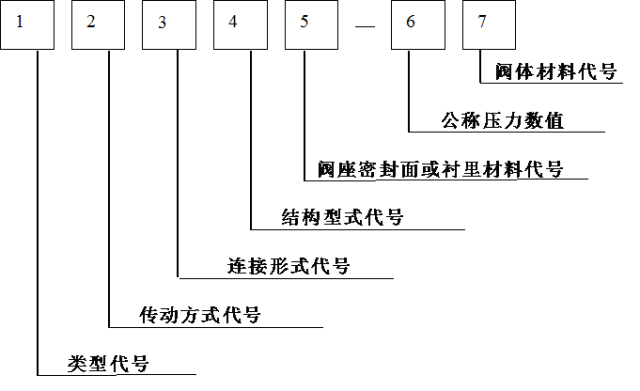 從上面分類中可以看出,閥門的品種是繁多的;如此繁多的品類,必須有一個統一的型號編制方法,才能讓使用者一看銘牌便知道某一種閥門的結構、材料和特性。按照《閥門型號編制方法》規定,閥門型號分七個單元: