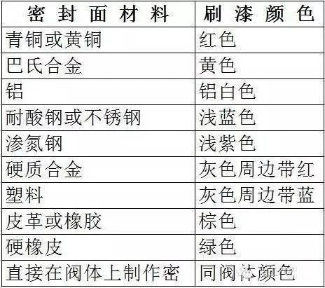 但耐酸鋼或不銹鋼閥體,也可以不涂漆。有色金屬閥體,不必涂漆。表示密封面材料的油漆,刷在手輪、手柄或自動閥件的蓋上,其顏色與密封面材料的關系如下: