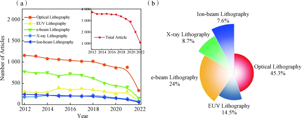 圖1 不同光刻技術相關的公開發表論文數量變化趨勢和占比