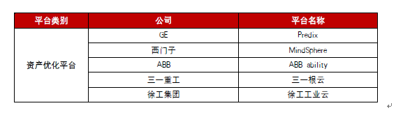 資產優化平臺主要運用在設備資產的管理與運營方面,它是通過現代傳感、移動通信等技術連接智能終端,并從終端收集關于設備、環境等各類數據信息,然后基于這些數據在云端利用大數據、人工智能等技術及行業經驗知識對設備運行狀態與性能狀況進行實時智能分析,再以工業App 程序的形式為生產與決策提供相應的智能化服務。資產優化平臺主要的參與廠商往往是工控企業以及大型設備生產商。資產優化平臺是未來制造業主導權競爭的制高點。它不僅能夠充分融入大數據、人工智能等先進技術,還能為第三方提供開發環境,如西門子的MindSphere 及GE 的Predix 平臺都提供軟件開發環境及工具,旨在通過第三方開發者和應用程序的接入形成類似Apple Store 的第三方開發應用生態。目前,工業巨頭是此類平臺主要的推進助力,如GE、西門子、ABB 等,我國的三一根云以及徐工工業云也屬于此類平臺,但發展程度相對滯后。