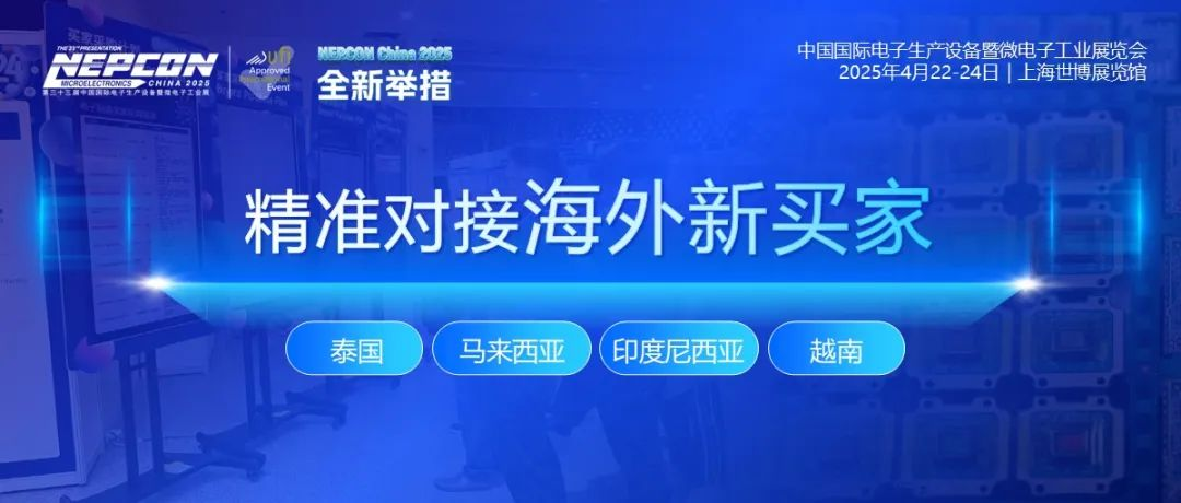 2025年4月22日至24日,第三十三屆中國(guó)國(guó)際電子生產(chǎn)設(shè)備暨微電子工業(yè)展(以下簡(jiǎn)稱NEPCON China 2025)將在上海世博展覽館拉開大幕。本屆展會(huì)已邀約來(lái)自越南、泰國(guó)、馬來(lái)西亞、印度尼西亞等海外電子制造企業(yè)新買家,以海外買家專場(chǎng)對(duì)接會(huì)+商貿(mào)導(dǎo)覽+主題參觀+商務(wù)交流+工廠參觀的多元形式,助力與海外新資源深度接洽,把握全球新商機(jī),拓展業(yè)務(wù)新商機(jī)!