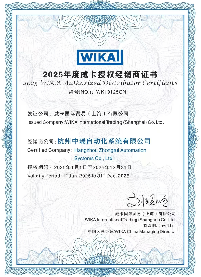 近日,杭州中瑞自動化系統有限公司正式獲得全球頂尖儀表品牌威卡(WIKA)頒發的2025年度授權經銷商證書,標志著雙方在工業自動化領域的深度合作邁上新臺階。即日起,國內客戶如需采購威卡全系列高精度儀表產品,杭州中瑞自動化將成為您最可靠的合作伙伴!
