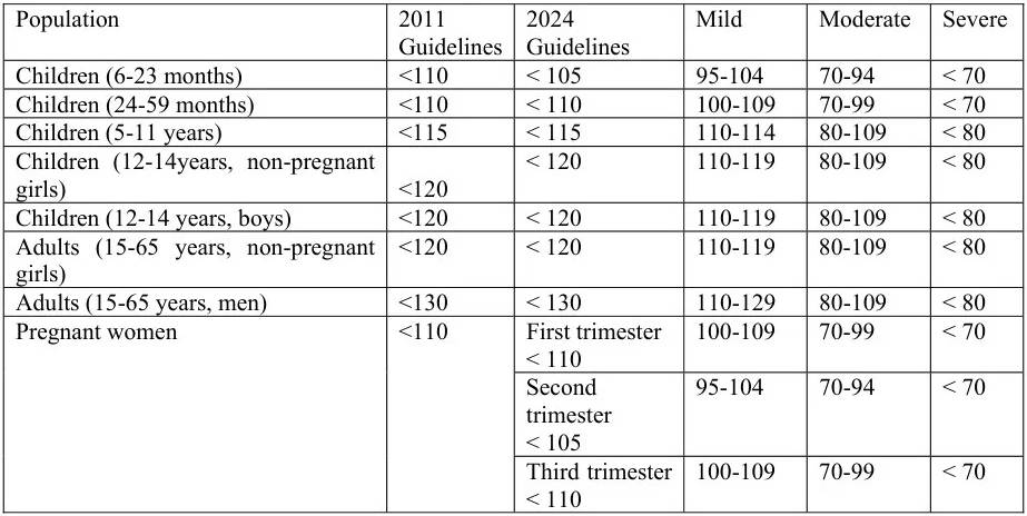 (WHO 2024年新指南將6-23月齡標準從<110g/L下調至<105g/L)