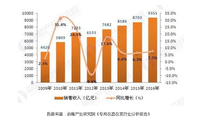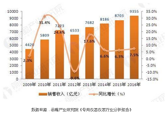 總體來看,近年來我國儀器儀表行業(yè)市場規(guī)模實現(xiàn)了快速擴張,銷售收入已由2009年的4420億元增至2016年的9355億元。2013年以來,我國儀器儀表行業(yè)產(chǎn)品銷售明顯回暖,增速趨于穩(wěn)定。2016年,我國儀器儀表行業(yè)銷售增速為7.5%。