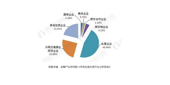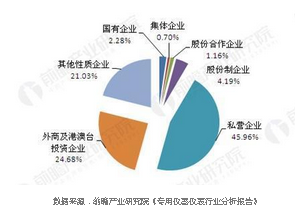 儀器儀表行業(yè)增速穩(wěn)定的另一面,是國內(nèi)外市場爭奪進入白熱化階段,競爭較為激烈。截至2017年3月,我國規(guī)模以上儀器儀表制造企業(yè)有4311家。私營企業(yè)數(shù)量占比達到45.96%;外商及港澳臺投資數(shù)量占比24.68%;股份制企業(yè)數(shù)量占比為4.19%;國有企業(yè)數(shù)量占比2.28%;股份合作企業(yè)和集體企業(yè)數(shù)量占比分別為1.16%和0.70%。