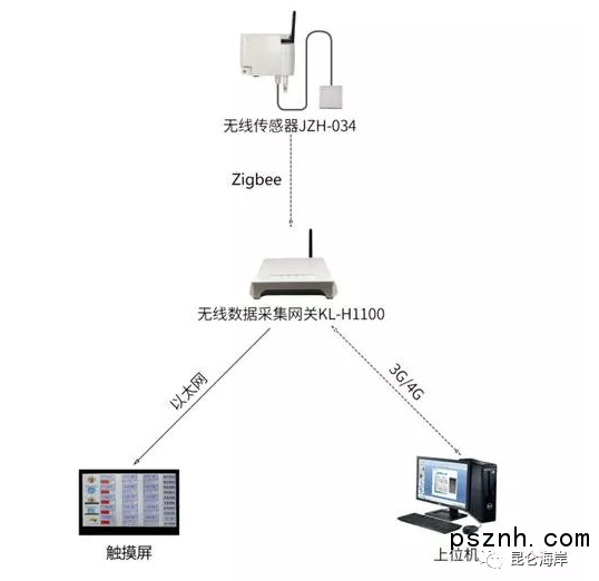 無線傳感器JZH-034,無線數據采集網關KL-H1100,觸摸屏,上位機,上位機軟件。