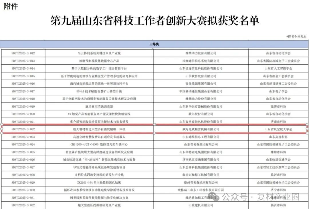 此次獲獎展示了威海光威精密機械有限公司在高端裝備創新領域的實力與擔當,也將進一步推動企業在航空航天與先進復合材料制造領域的深度布局。